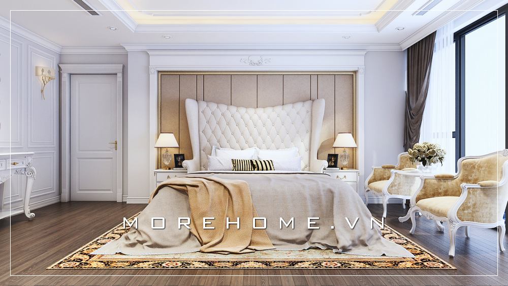 Thiết kế giường ngủ chung cư cao cấp, phong cách tân cổ điển tinh tế nhấn sâu vào từng đường nét chạm khắc, uốn lượn toát lên vẻ sang trọng và đẳng cấp của chủ nhân