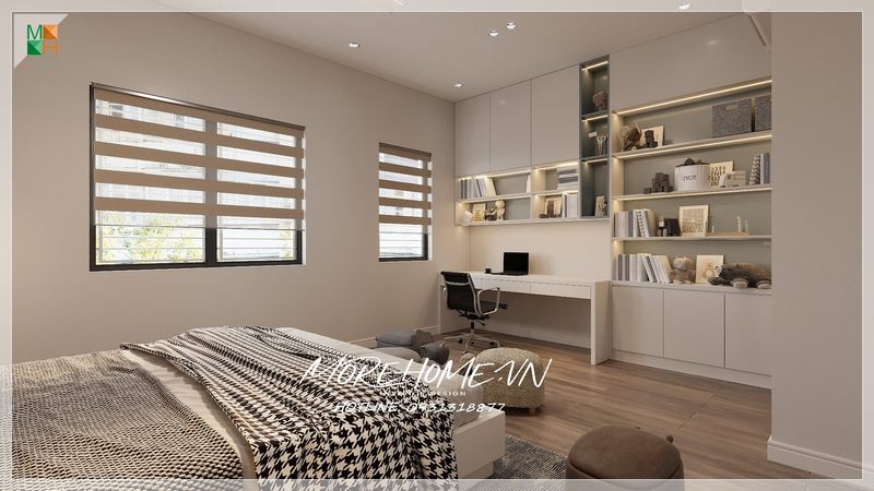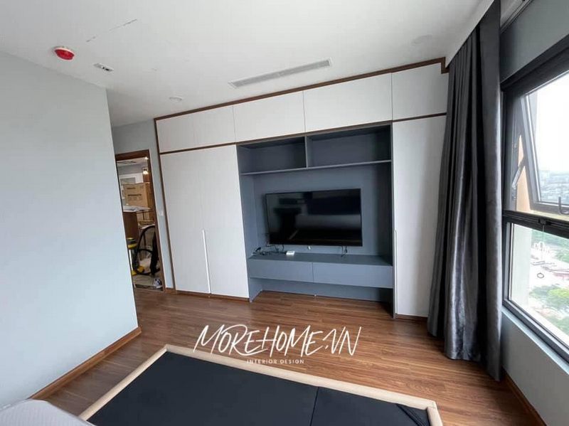Tủ trong căn phòng ngủ của căn hộ có thể được sử dụng để lưu trữ quần áo cũng như làm kệ để đặt tivi, giúp gia chủ tiết kiệm không gian và không làm căn phòng bị chật hẹp.