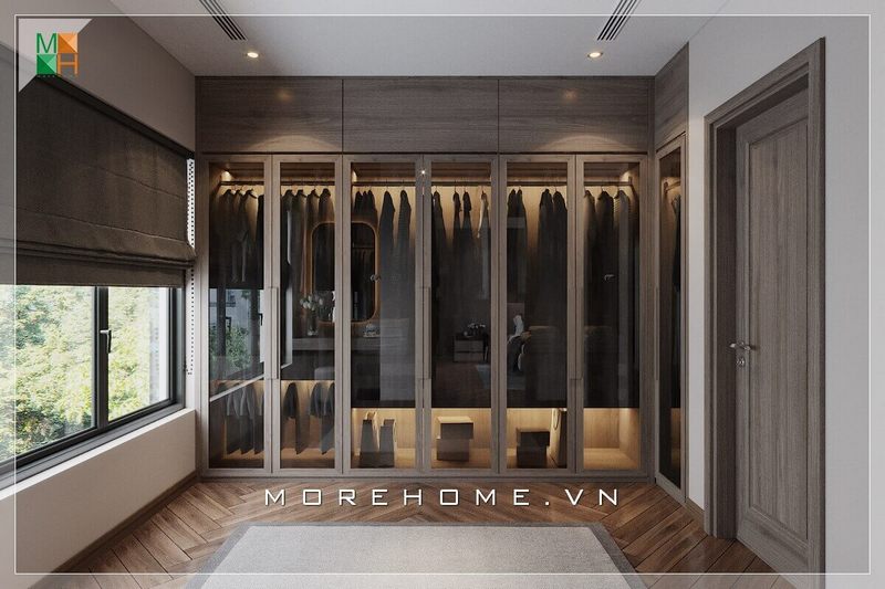 Hệ tủ quần áo kịch trần chất liệu gỗ chủ đạo, cửa kính cánh mở, sàn lát gỗ kiểu xương cá, rèm cửa sổ đều được trang trí bằng màu nâu trầm giúp tôn lên vẻ đẹp thanh lịch và tao nhã của mẫu phòng thay đồ này.