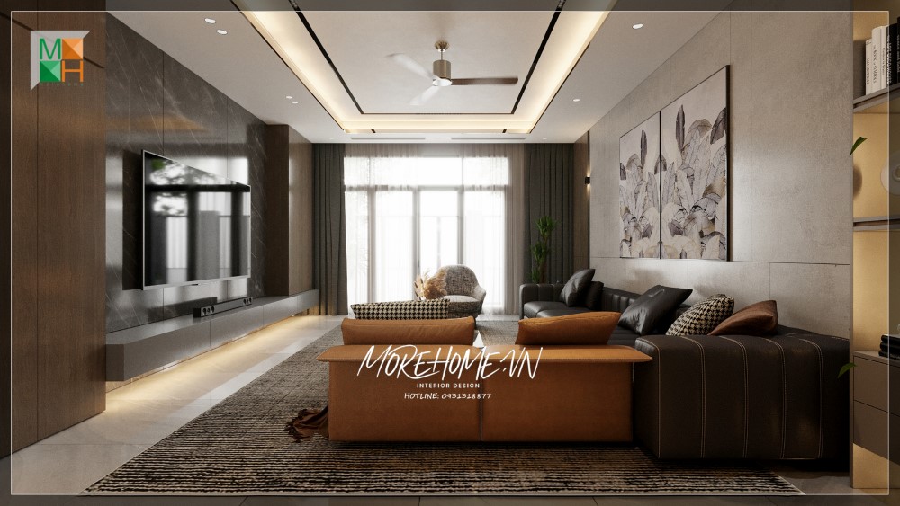 Phòng khách được thiết kế và trang trí nội thất hiện đại với các tiện nghi phù hợp với diện tích không gian.